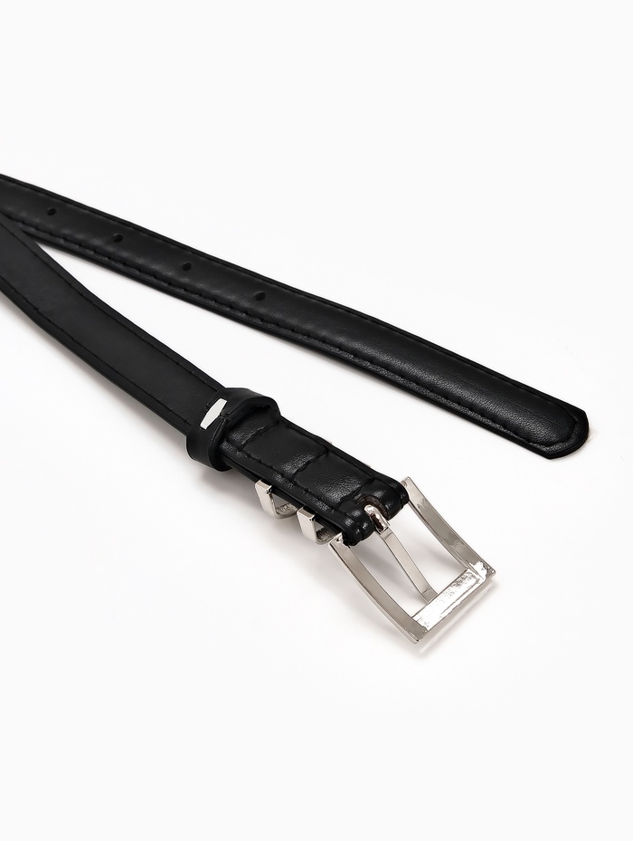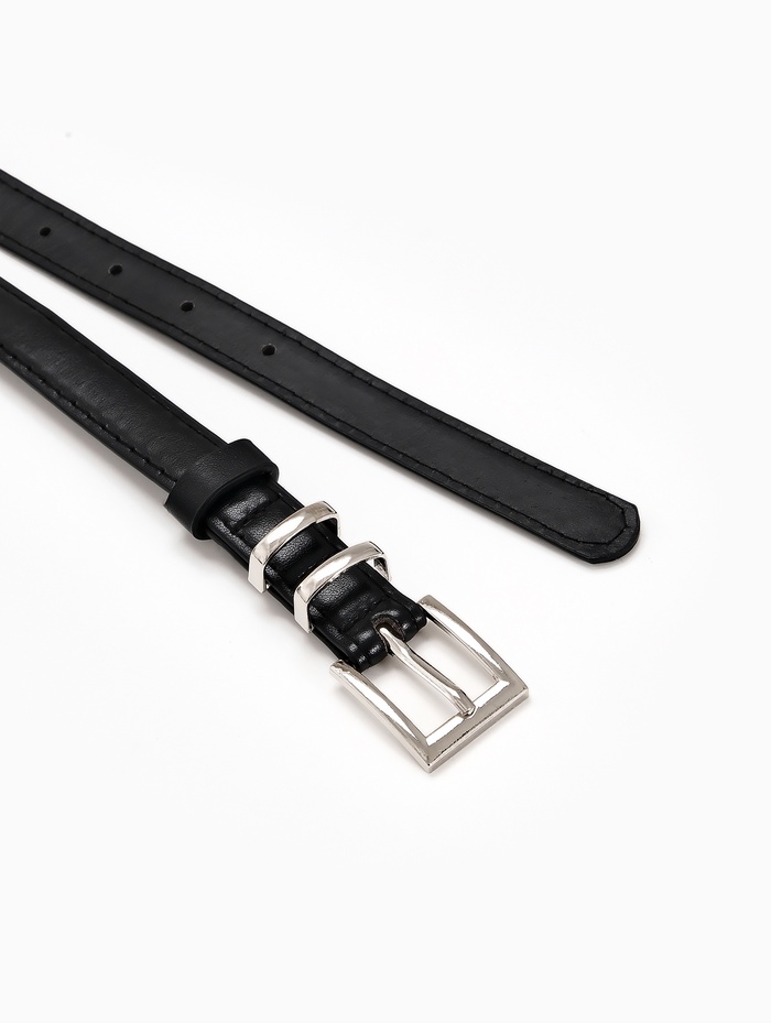 Ремень сочетается с офисными брюками, платьями-футлярами и джинсами. Серебряная фурнитура создает гармоничный акцент с украшениями в холодных тонах. Одно отверстие обеспечивает оптимальное положение, а ширина 2 см сохраняет пропорции в деловом образе.