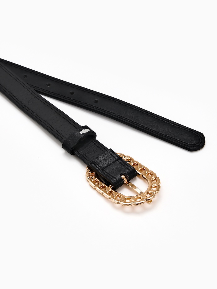 Женский ремень чёрного цвета с золотой пряжкой имеет классическую ширину 2,5 см, которая подходит для повседневной носки. Модель сохраняет лаконичный силуэт, мягко подчёркивая линию талии. Золотистая фурнитура добавляет акцент, не перегружая образ.