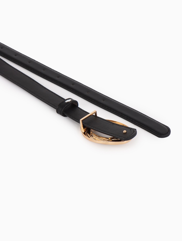 Узкий черный ремень с декоративной пряжкой-гвоздиком — изящный акцент для платьев, завышенных брюк и юбок. Модель с золотистой фурнитурой создает деликатный акцент, не утяжеляя силуэт.