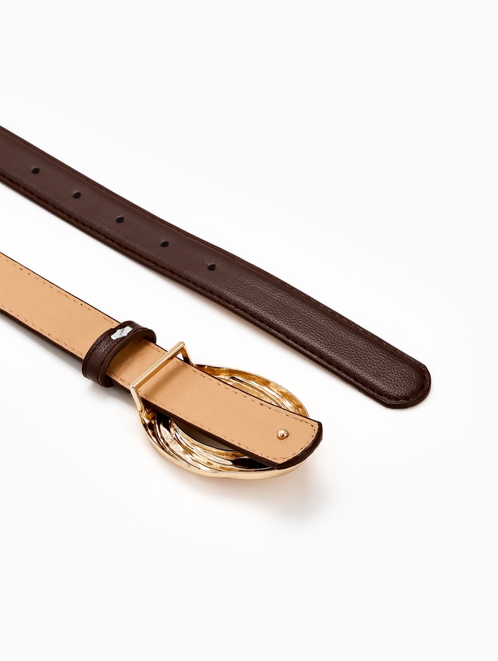Узкий ремень из искусственной кожи мягко обозначает талию, сохраняя легкость силуэта. Вы подчеркиваете естественную линию тела, не добавляя строгости. Аксессуар сочетается с золотыми украшениями и коричневой обувью, завершая гармоничный ансамбль.