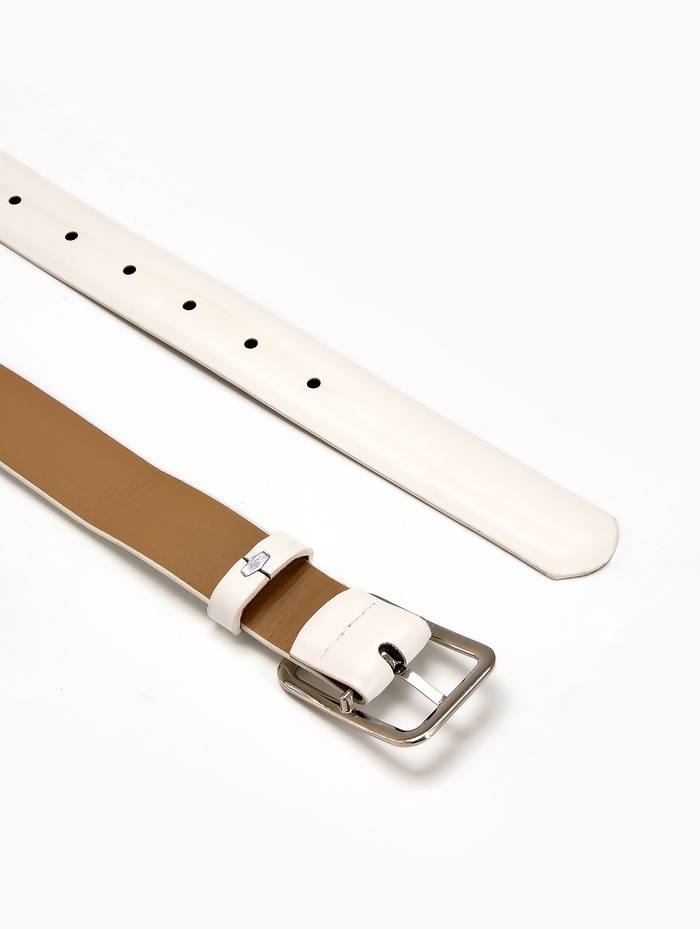 Белый ремень сочетается с летними платьями, льняными брюками и светлыми комплектами. Матовая поверхность пряжки создает сдержанный акцент, который не конфликтует с другими металлическими элементами. Ширина 3 см обеспечивает четкий силуэт, сохраняя легкость летнего образа.