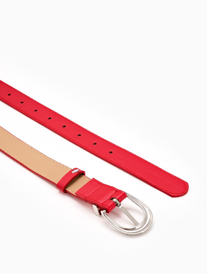 Красный ремень с серебряной пряжкой создает выразительный акцент в вашем гардеробе. Насыщенный цвет привлекает внимание, а лаконичный дизайн сохраняет универсальность. Ширина 3 см мягко подчеркивает талию, сохраняя комфорт при повседневной носке.