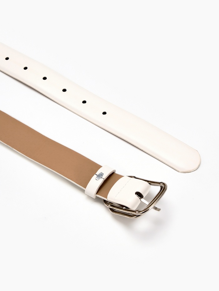 Белая широкая модель хорошо сочетается с летними платьями, легкими брюками и комбинезонами. Она добавляет структуру в свободные силуэты, сохраняя легкость образа. Серебряная пряжка создает гармоничный акцент с металлическими деталями украшений, а одно отверстие помогает точно настроить посадку по фигуре.