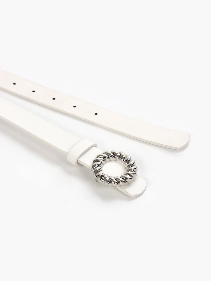 Этот белый ремень — тот самый аксессуар, которого не хватает в вашем гардеробе. Он не просто держит брюки, а завершает образ, добавляя ему лёгкости и стильной строгости. Узкая ширина и классическая серебряная пряжка-затяжка делают его универсальным спутником для юбок, платьев и джинсов.