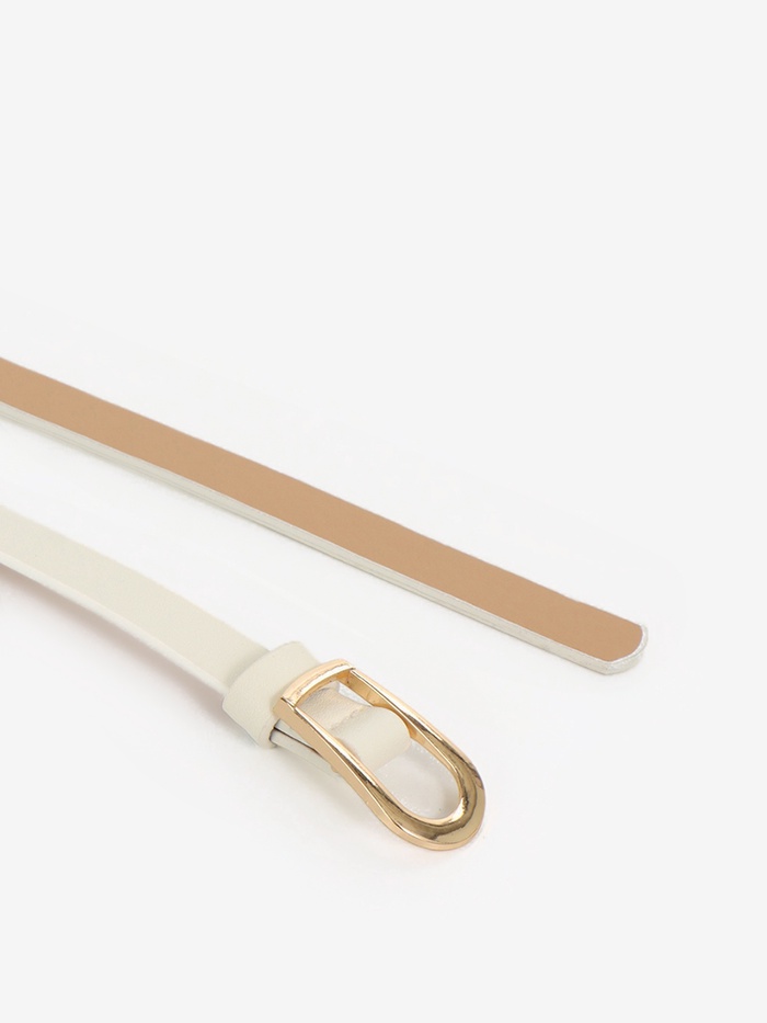 Узкий белый ремешок с золотой затягивающейся пряжкой — свежий акцент для летних образов. Минималистичный дизайн шириной 1.2 см подчеркивает талию, сохраняя ощущение легкости.