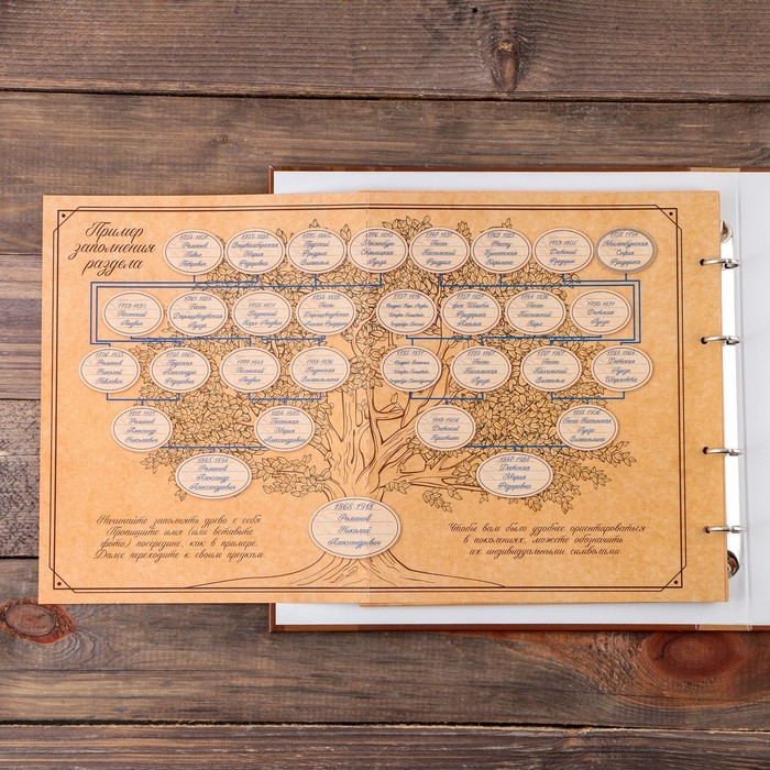 Родословная книга в твёрдом переплёте содержит 34 листа (включая инструкции, наименование частей, лист генеалогического древа формата А2) и лист наклеек. Обложка книги украшена деревянным элементом.