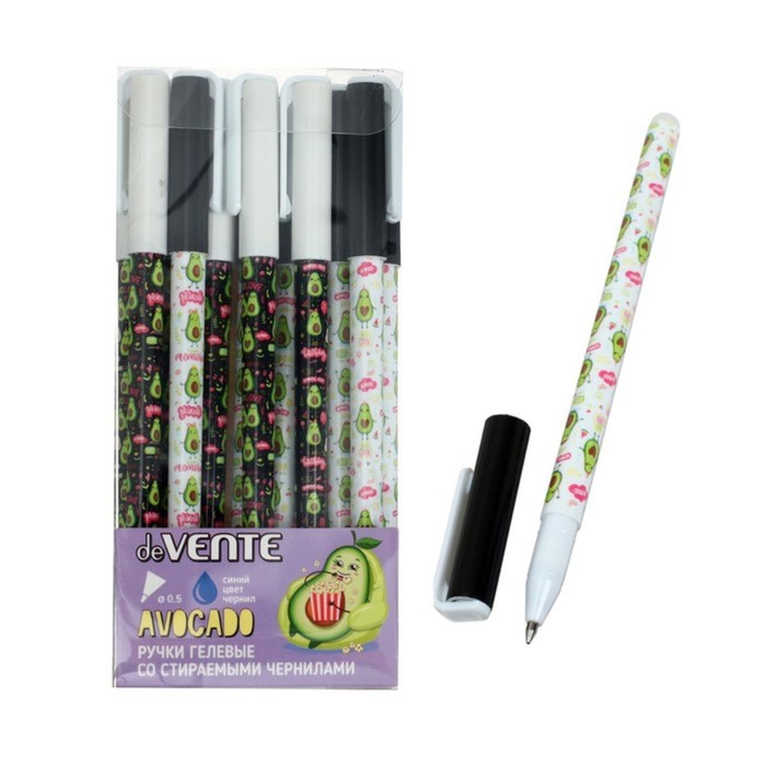 Ручка гелевая стираемая "deVENTE. Пиши-стирай. Avocado" d=0,5 мм, 2 дизайна корпуса ассорти, с ластиком, сменный стержень, индивидуальная маркировка, синяя.