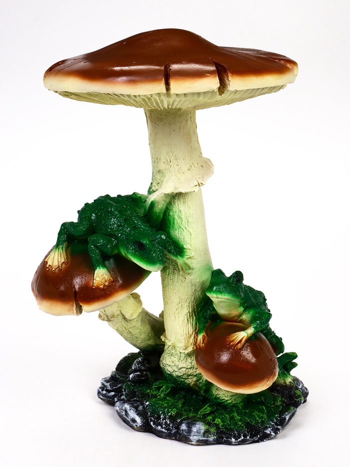 - Природный сюжет: лягушки и грибы ассоциируются со спокойными зонами сада, поэтому композиция органично смотрится среди растений.