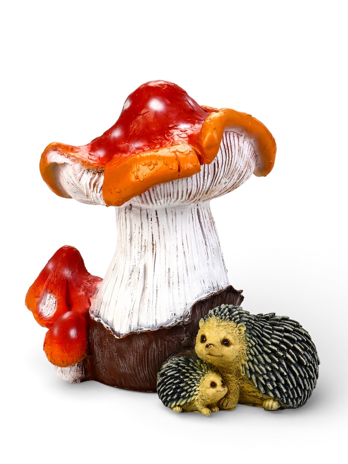 - Детализированная проработка: рельеф шляпки, текстура ножки, аккуратные иголки и мордочки ежей добавляют выразительности участку.