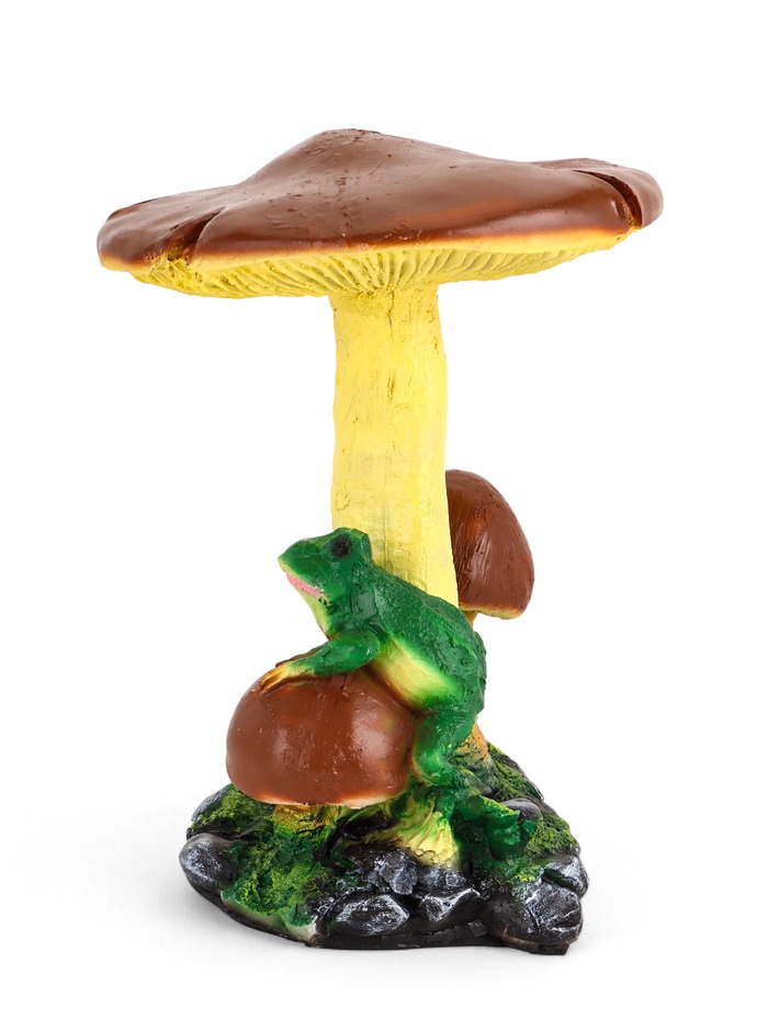 Идея для сада: Композиция высотой 35 см хорошо смотрится у дорожки, под кустом хосты или у края пруда. Лягушка на грибе словно наблюдает за происходящим, добавляя сюжета в ландшафт. Эта садовая фигура делает пространство законченным и уютным — место словно оживает.