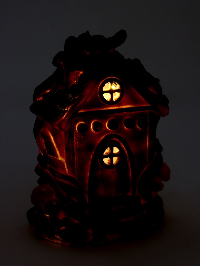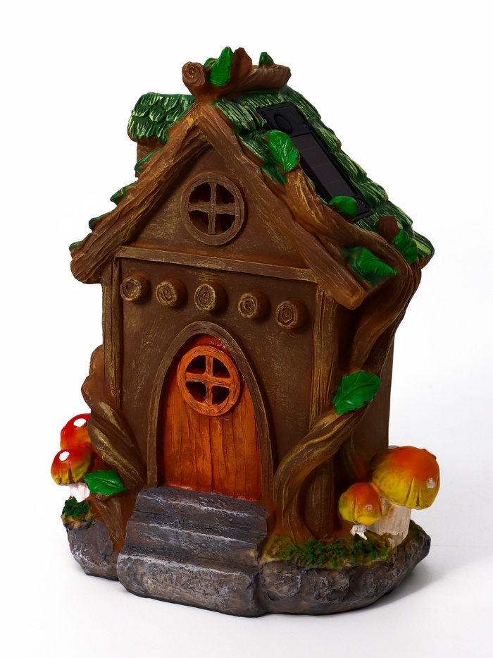 Садовый фонарь в виде сказочного домика — декоративный светильник для участка, террасы или зоны отдыха, выполненный из полистоуна. Он создаёт мягкое точечное освещение и работает не как источник яркого света, а как элемент настроения и композиции.