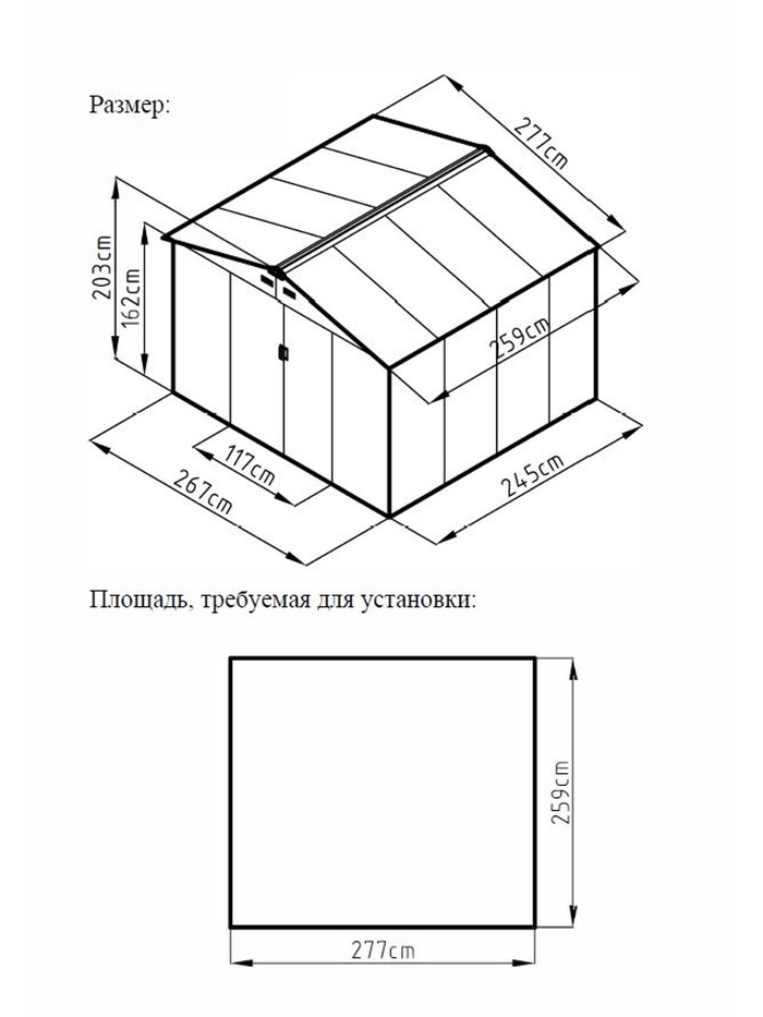 Технические характеристики Сарай WOTEX Storage-05-3, тёмно-серый с белым, 277х259х203 см