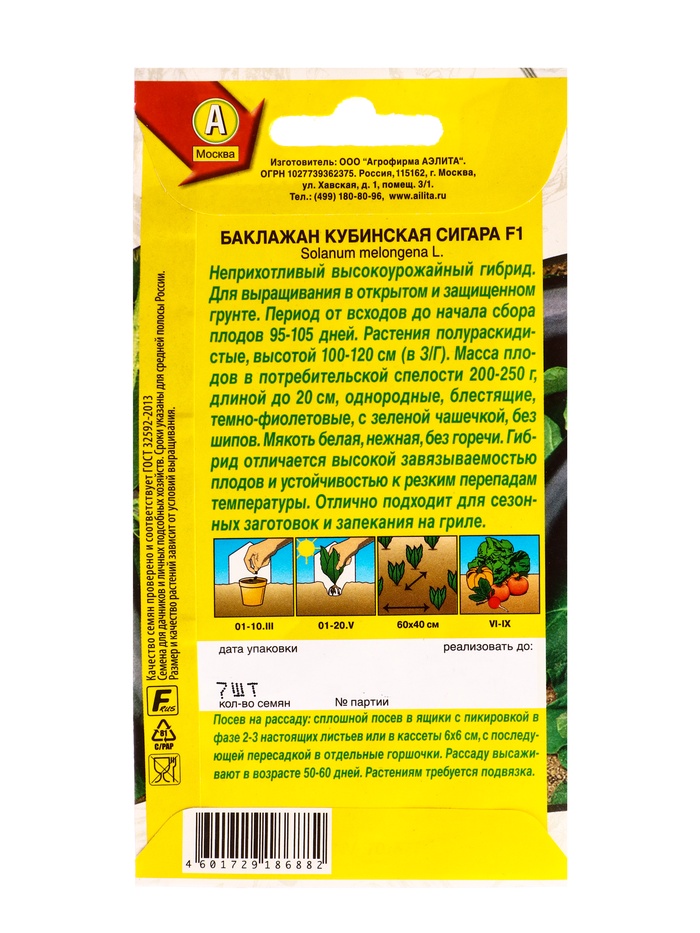 Технические характеристики Семена Баклажан Кубинская сигара F1 Мир высокого урожая, Ц/П,7 шт.