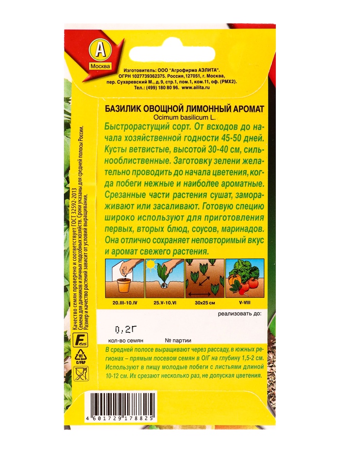 Семена Базилик овощной Лимонный аромат Популярные пряности, Ц/П,0,2 г