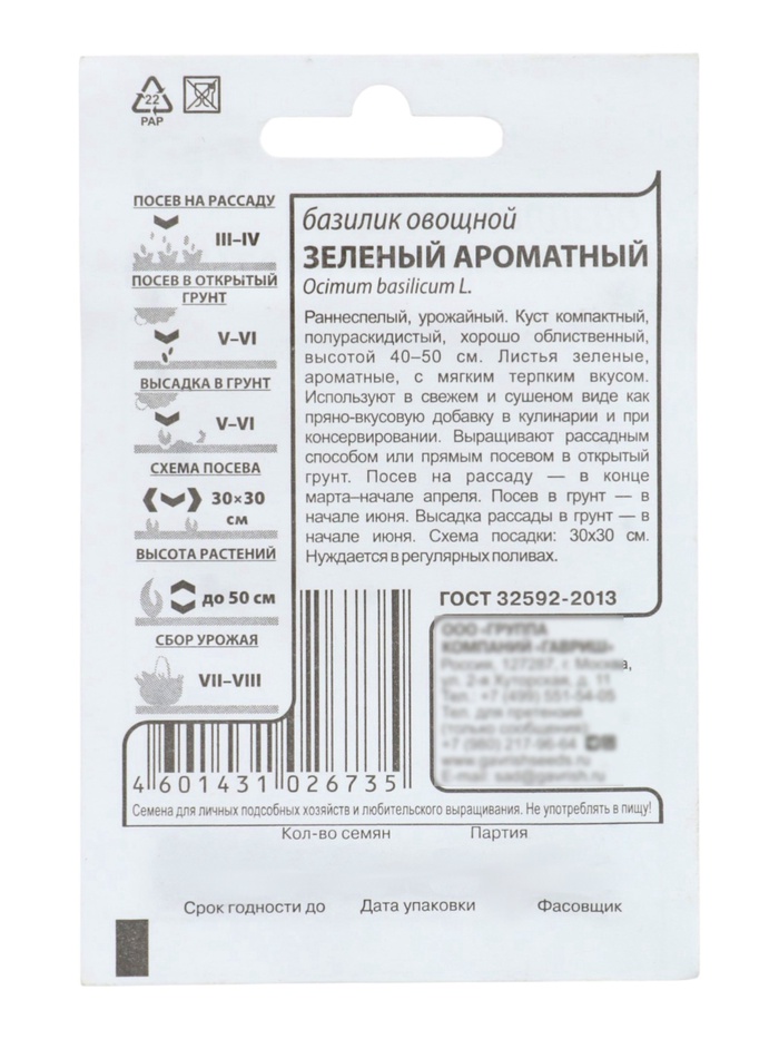 Семена Базилик "Зеленый ароматный", б/п, 0,1 г