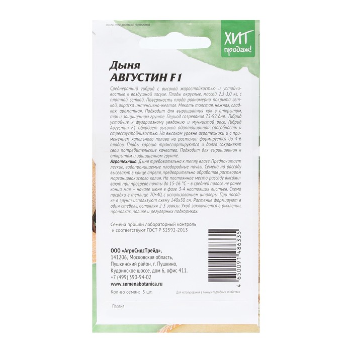 Среднеранний гибрид с высокой жаростойкостью и устойчивостью к воздушной засухе. Плоды округлые, массой 2,5-3,0 кг, с плотной сеткой. Поверхность плода равномерно покрыта сеткой, окраска интенсивно-желтая. Мякоть толстая, нежная, сладкая, ароматная. Подходит для выращивания как в открытом, так и защищенном грунте. Период созревания 75-92 дня. Гибрид устойчив к фузариозному увяданию и мучнистой росе. Гибрид Августин F1 обладает высокой адаптационной способность и стрессоустойчивостью. На высоком уровне агротехники и с применением капельного полива на растении формируется до 4-6 плодов. Плоды хорошо транспортируются и долго сохраняют свои потребительские качества. Подходит для выращивания в открытом и защищенном грунте.