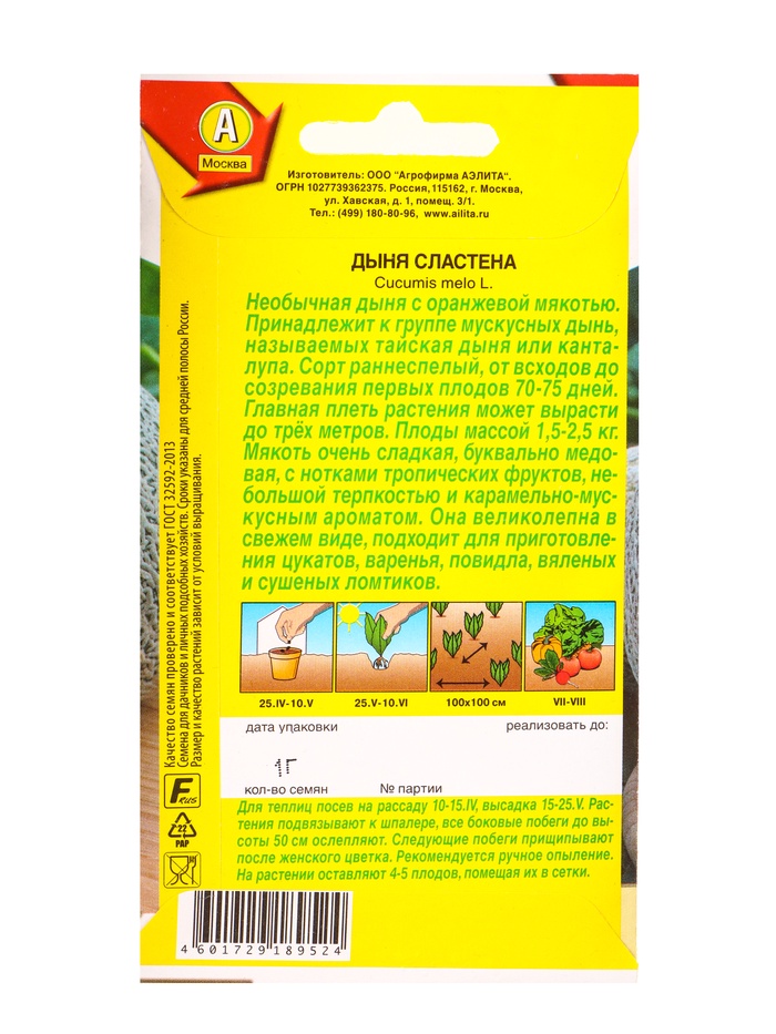 Технические характеристики Семена Дыня Сластена Сладкоежка, Ц/П,1 г