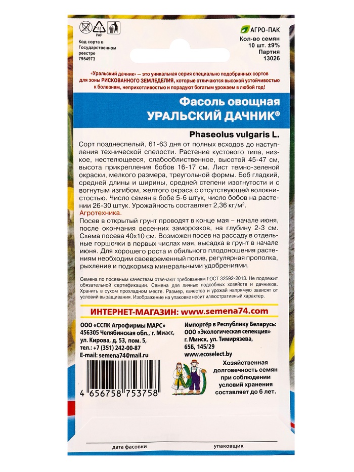 Семена Фасоль Уральский дачник - овощная (УД) Е/П , Е/П, 10 шт.