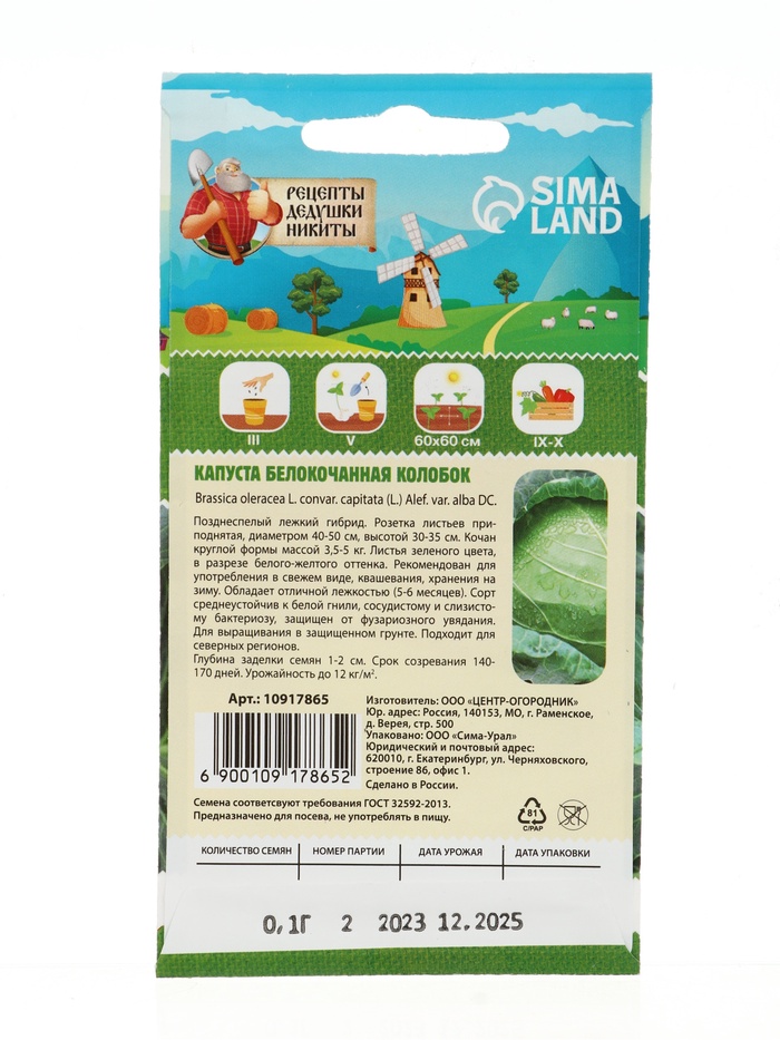 Технические характеристики Семена Капуста белокочанная "Колобок", 0,1 г
