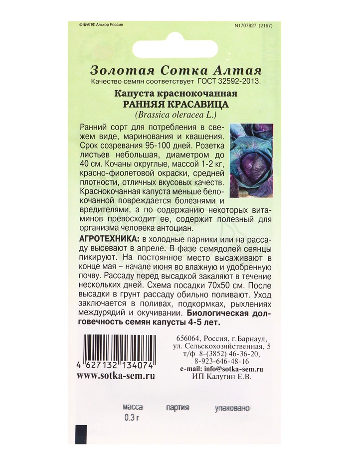 Семена Капуста «Ранняя красавица», 0.3 г, «Золотая Сотка Алтая»
