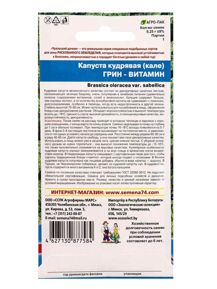 | Материалы из которых произведен товарСемена | Минимальная партия3 | Объем бокса12.464 |