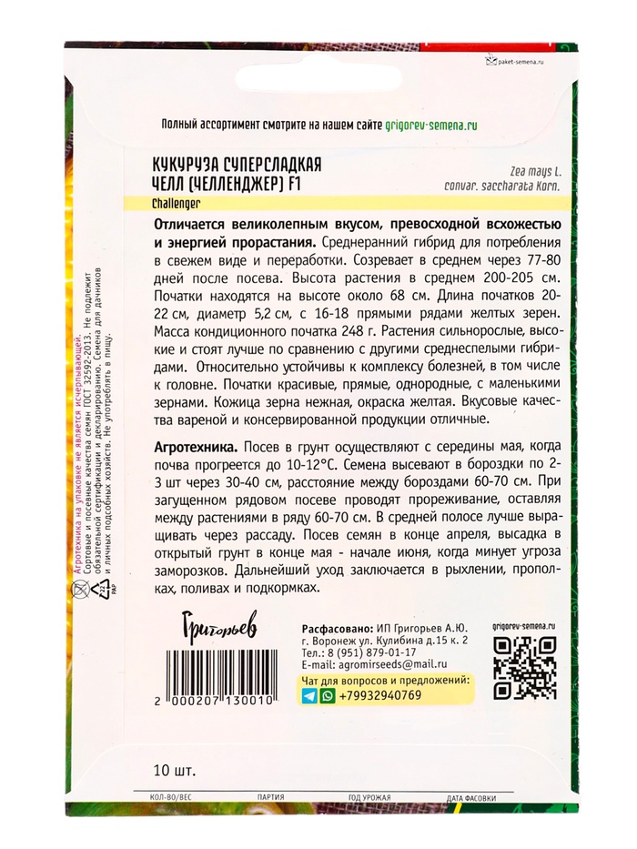Технические характеристики Семена Кукуруза Челл F1 суперсладкая (Челленджер) 10 шт. 12.29 г.