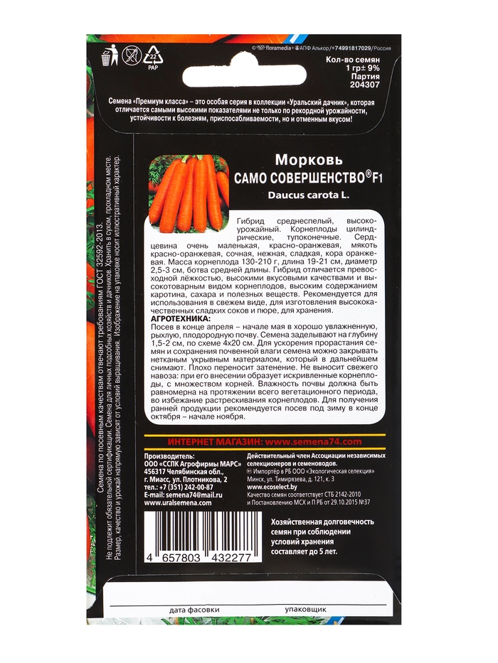 | Материалы из которых произведен товарСемена | Минимальная партия2 | Объем бокса12.464 |