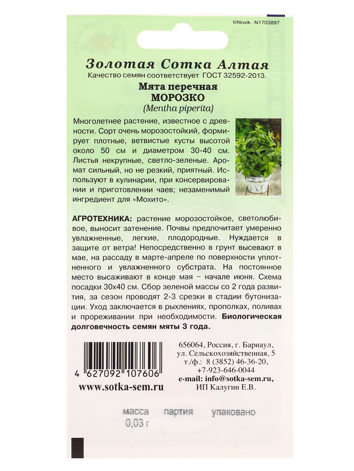 Семена Мята Морозко /Сотка/ 0,03г/ перечная многолет. до 50см /*1500