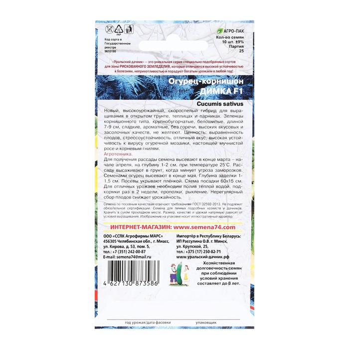 Агротехника. Для получения рассады семена высевают в конце марта - вначале апреля, на глубину 1-2 см, при температуре 25°С. Рассаду. высаживают в грунт, когда минует угроза заморозков. Семенами огурец высевают в конце мая. Глубина заделки 1-1,5 см. Посевы укрывают плёнкой. Схема посадки 60х15 см. Для отличных урожаев-необходим полив тёплой водой, подкормки раз в2 недели, прополки, рыхление. Нерегулярный сбор плодов снижает урожайность.