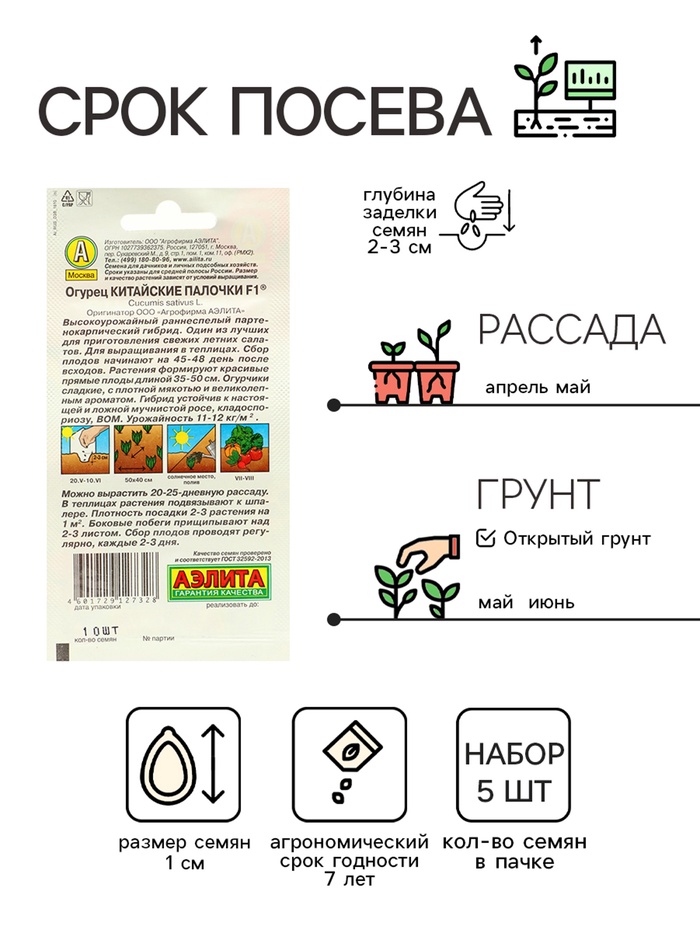 Технические характеристики Семена Огурец "Китайские палочки" F1 партенокарпический,набор 5 шт