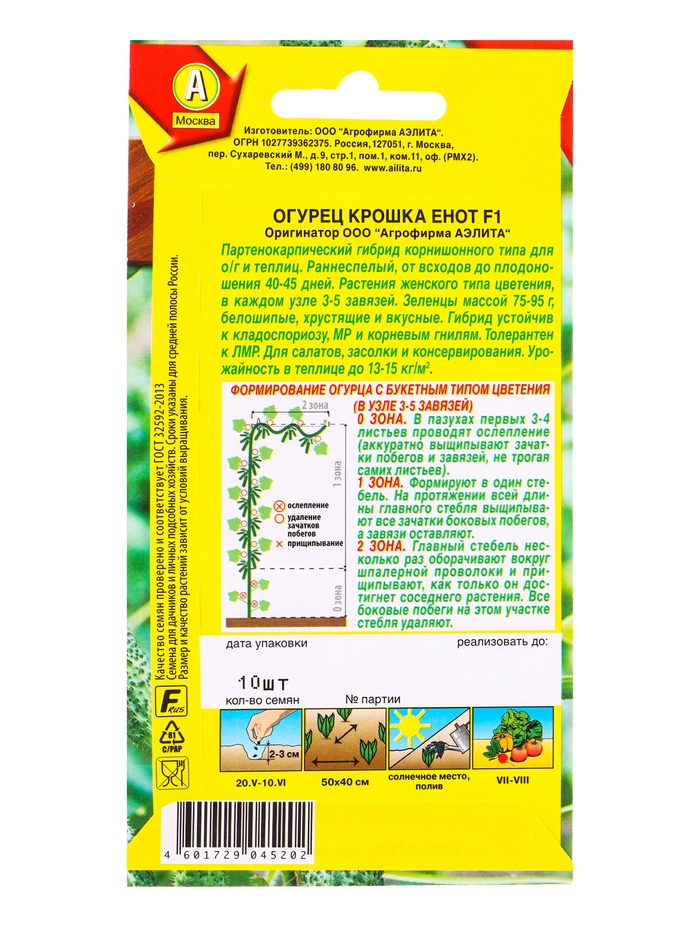 Технические характеристики Семена Огурец «Крошка енот», партенокарпический, 10 шт., «Агрофирма АЭЛИТА»