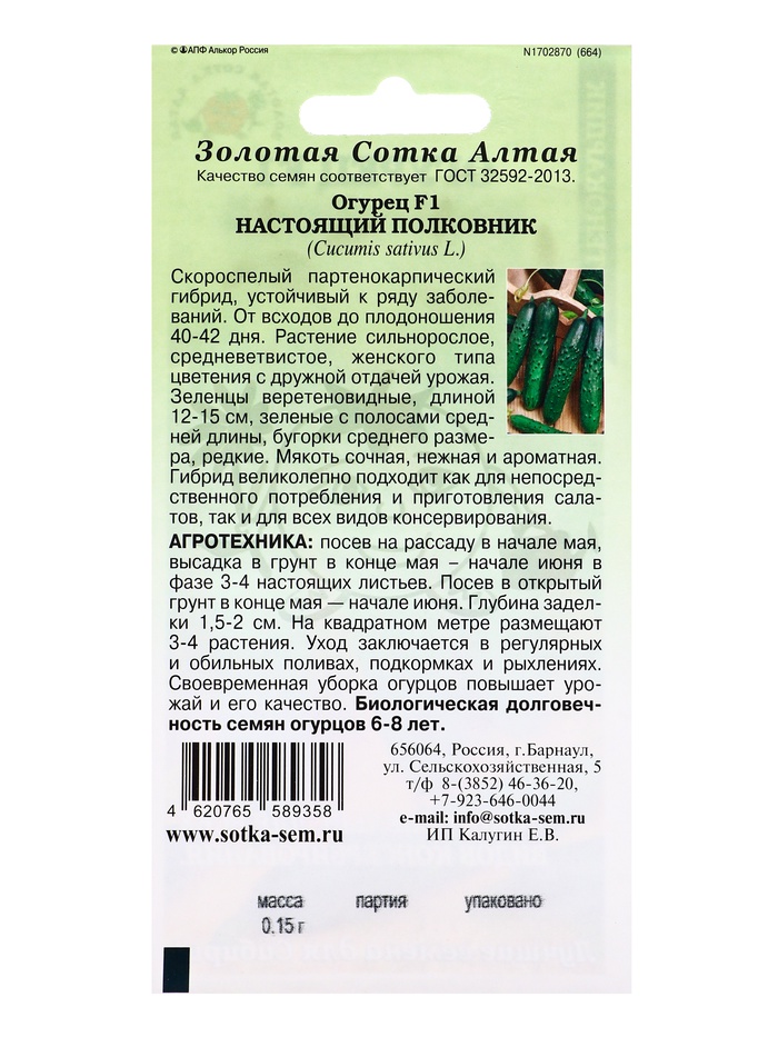 Семена Огурец «Настоящий полковник», F1, 0.15 г, партенокарпический, раннеспелый, «Золотая сотка Алтая»