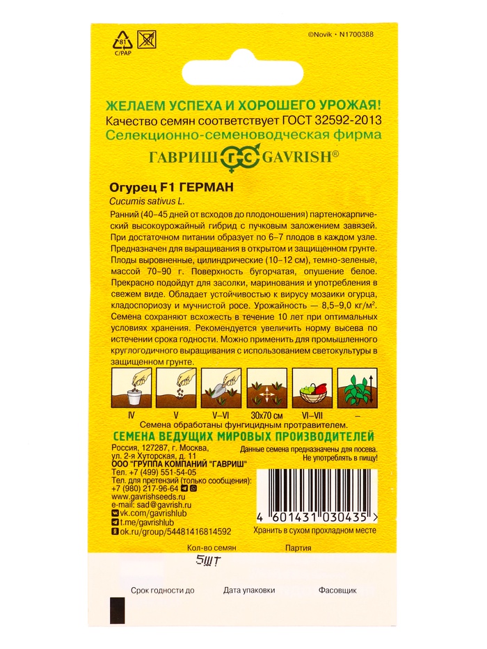 Технические характеристики Семена огурца "Герман", F1, 5 шт.