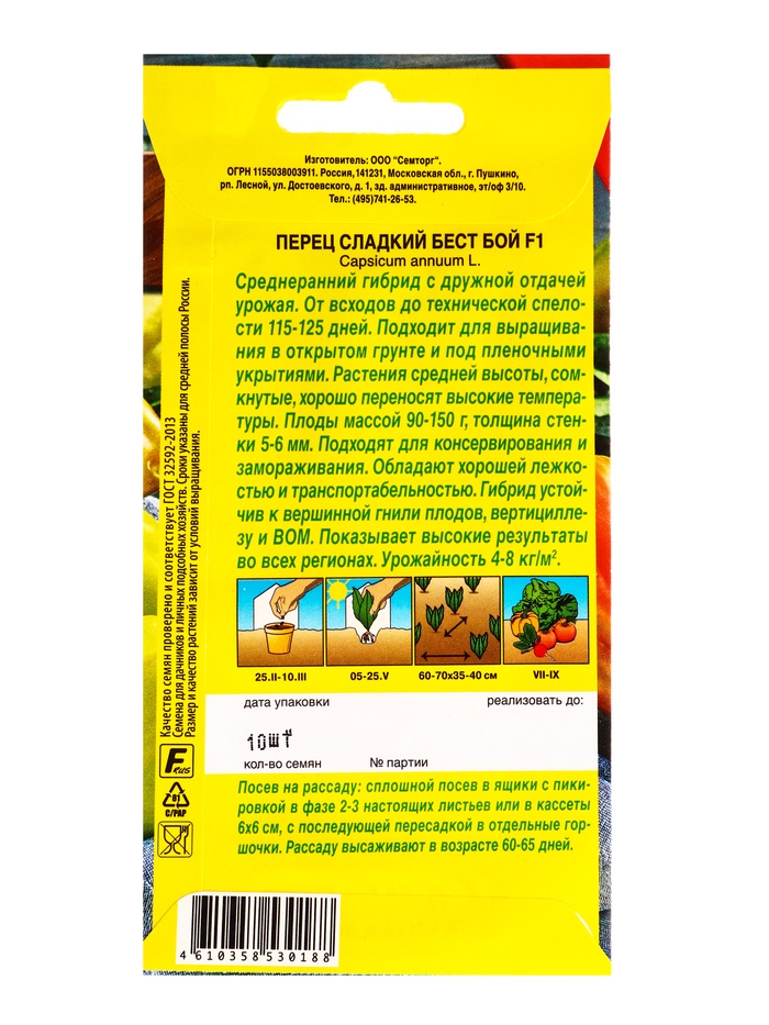 Технические характеристики Семена Перец сладкий Бест Бой F1 Семторг, Ц/П СТ,10 шт.