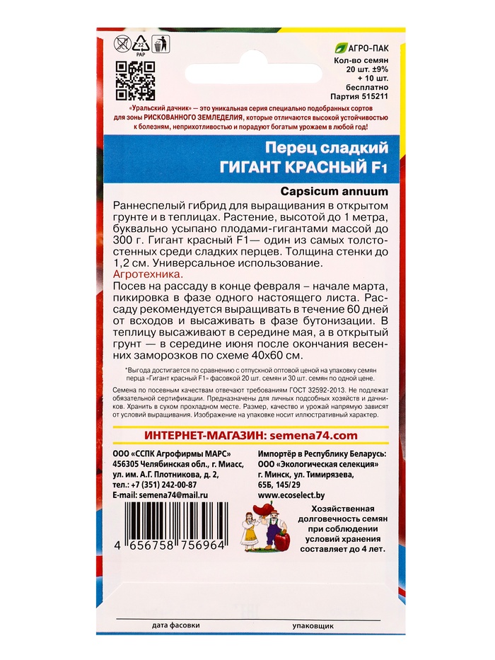 Семена Перец сладкий Гигант красный F1 (УД) Е/П +50% БЕСПЛАТНО , Е/П, 20шт+10шт беспл.