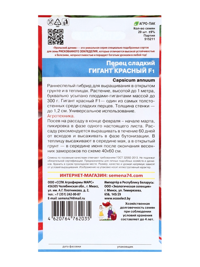 Технические характеристики Семена Перец сладкий "Гигант", красный, набор 5 шт