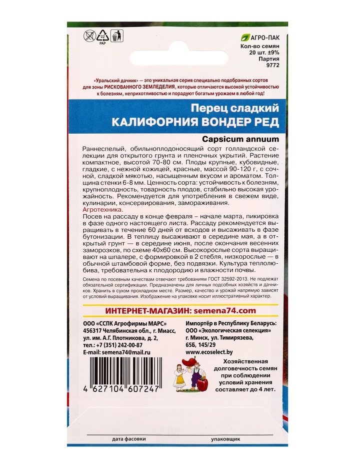Семена Перец сладкий Калифорния вондер ред (УД) Е/П , Е/П, 20 шт.