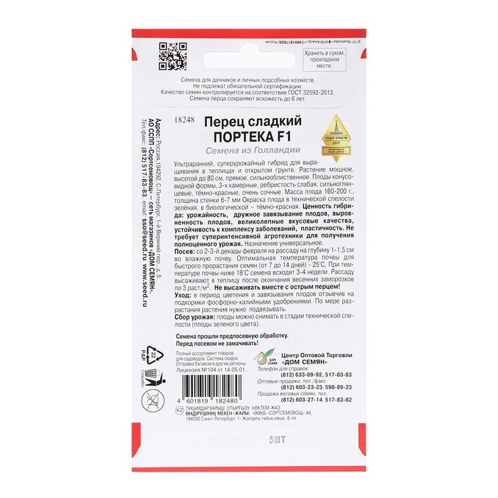 Технические характеристики Семена Перец сладкий "Портека", 5 шт