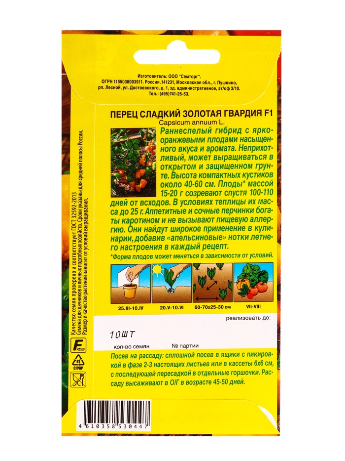 Семена Перец сладкий Золотая гвардия F1 Семторг, Ц/П СТ,10 шт.