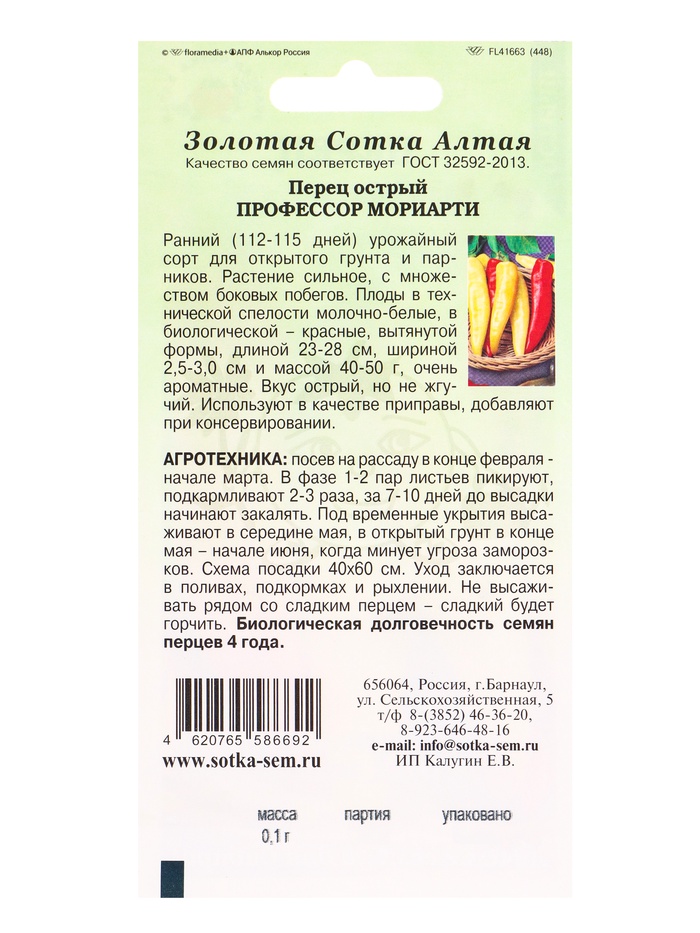 Технические характеристики Семена Перец «Профессор Мориарти острый», 0.1 г, раннеспелый, « Золотая Сотка Алтая»