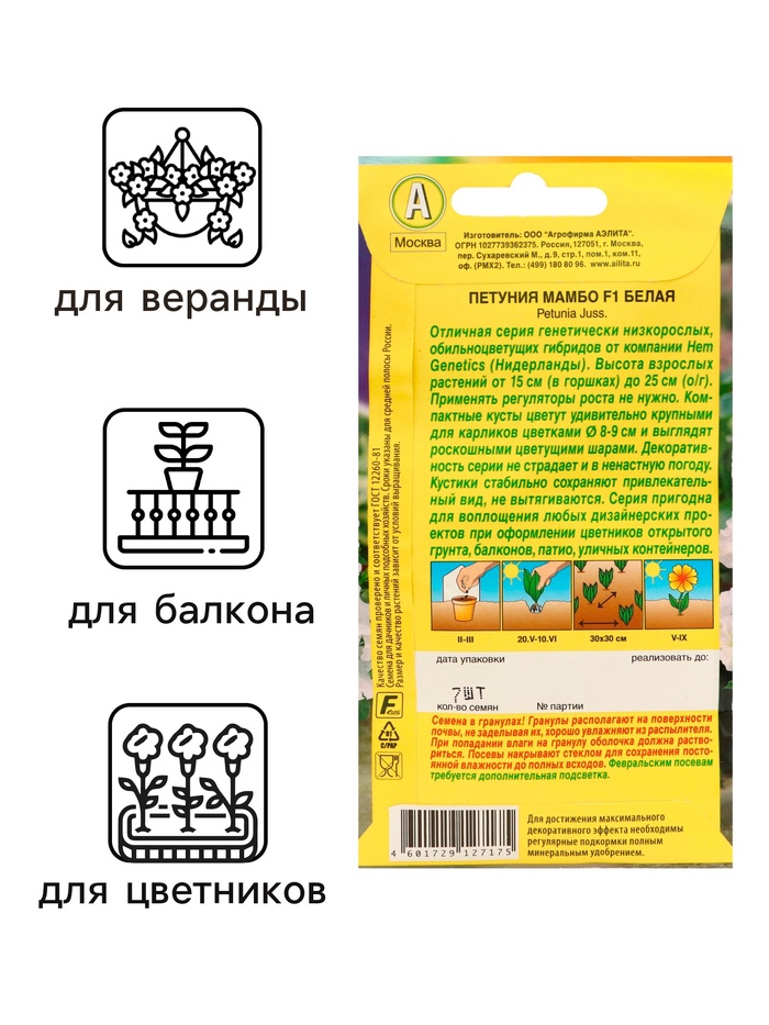 Технические характеристики Семена Петуния "Мамбо" F1 белая многоцветковая,набор 5 шт