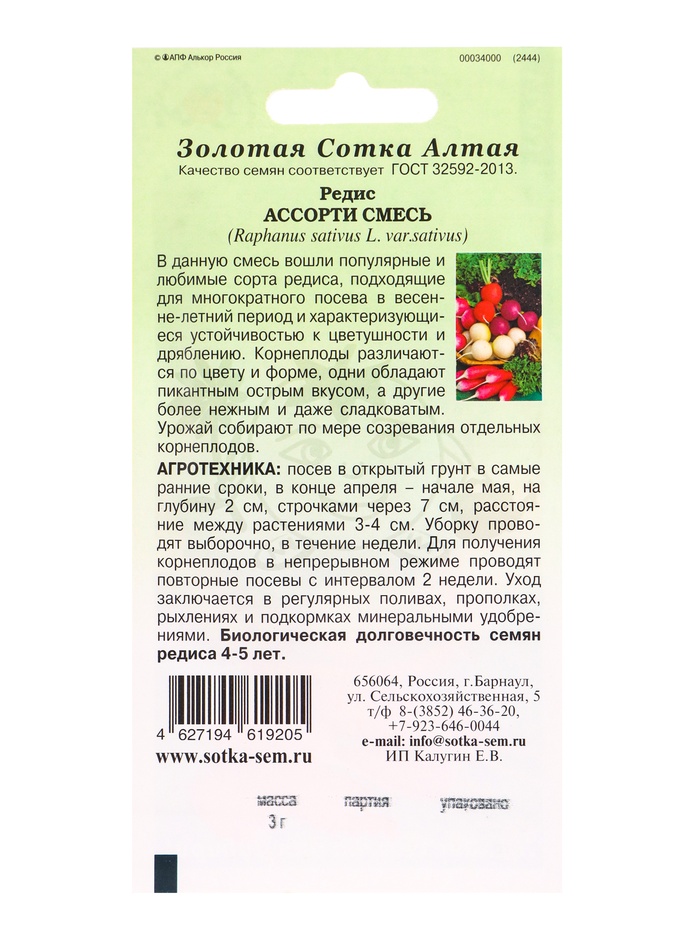 Семена Редис «Ассорти», смесь, 3 г, «Золотая Сотка Алтая»