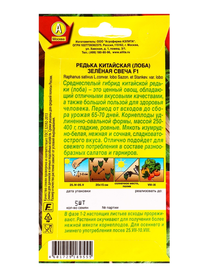 Семена Редька китайская «Зелёная свеча», F1, 5 шт., «Агрофирма АЭЛИТА»