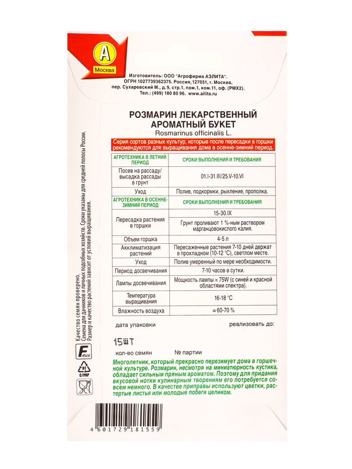 Технические характеристики Семена Розмарин Ароматный букет Лето продолжается., Ц/П,15 шт.