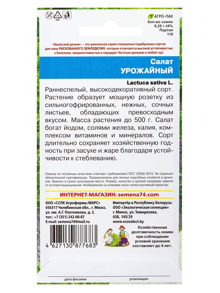 Семена Салат Урожайный (УД) Е/П , Е/П, 0,25 г.