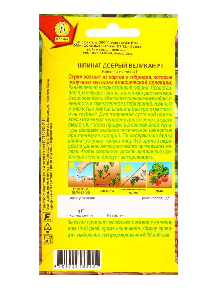 Технические характеристики Семена Шпинат Добрый великан F1 Профи-Аэлита, Ц/П,1 г