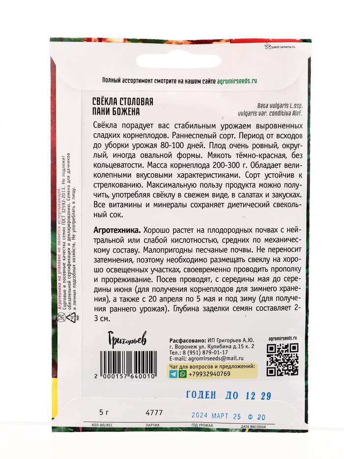 Семена Свёкла Пани Божена столовая 5г. 12.29 г.