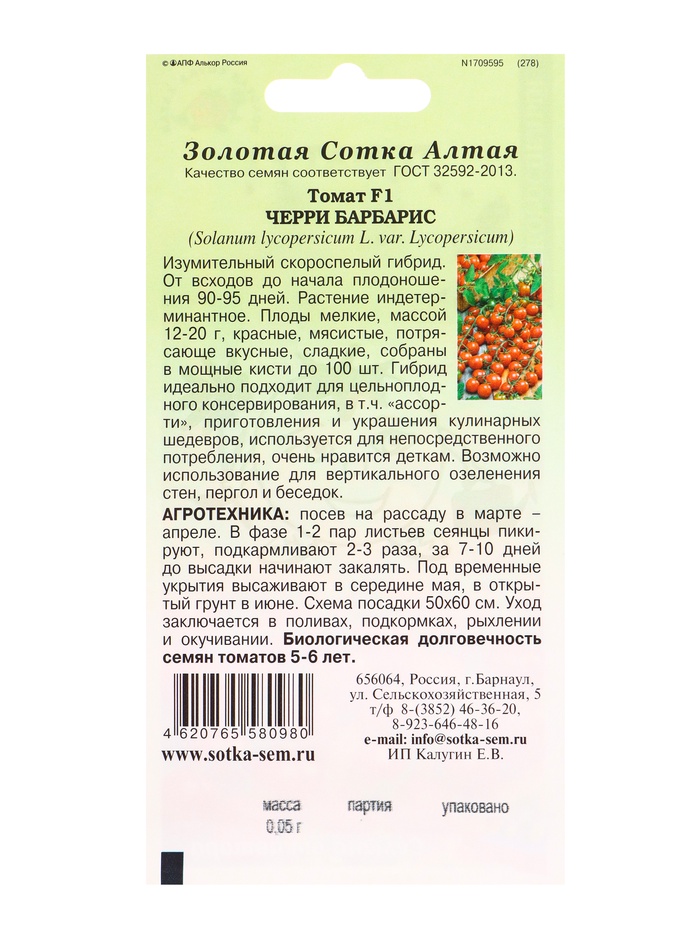 Семена Томат «Черри Барбарис F1», 0.05 г, ранний, индетерминантное, красный, «Золотая сотка Алтая»