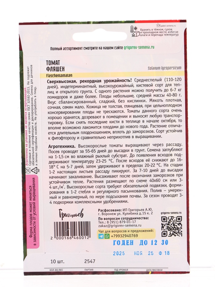Технические характеристики Семена Томат Фляшен 10 шт. 12.29 г.