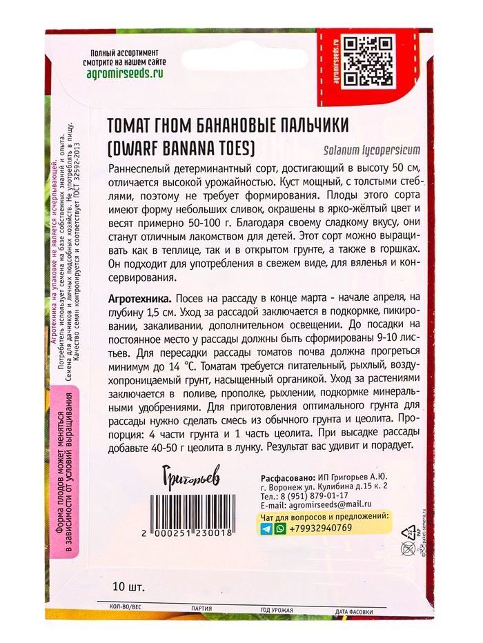 Технические характеристики Семена Томат Гном Банановые Пальчики (Dwarf Banana Toes) 10 шт. 12.29 г.